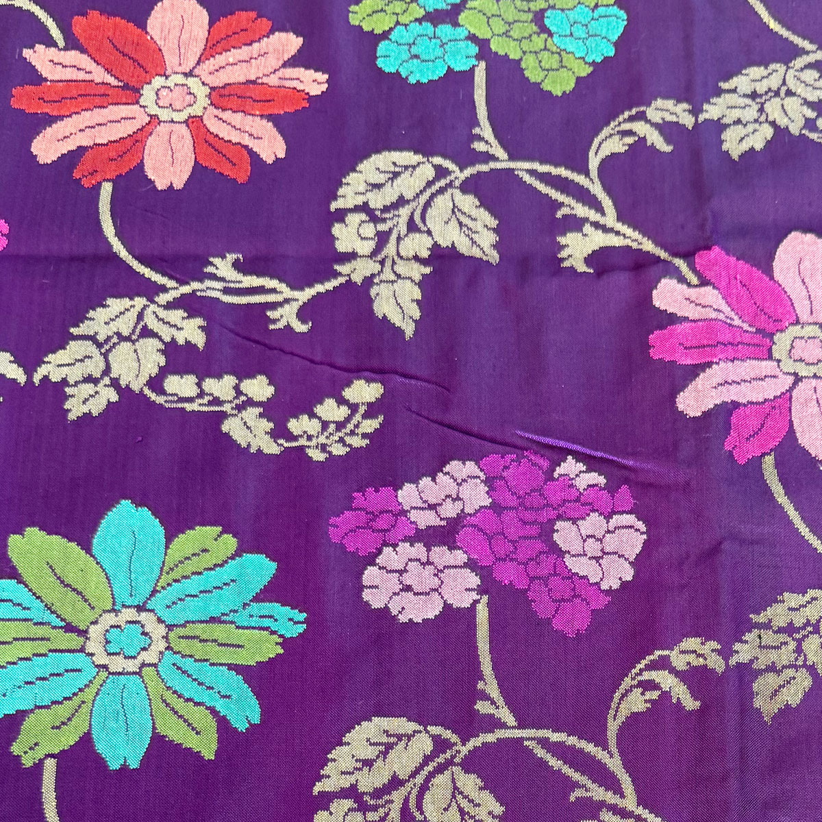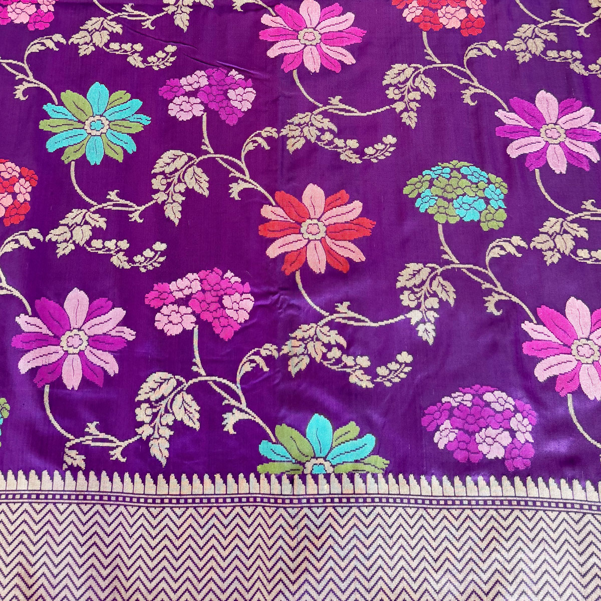A regal Bangani purple Katan silk saree woven with pure silver zari, showcasing a magnificent multicolored floral jangla design in intricate Kaduwa weave — a true epitome of Banarasi elegance and grandeur.