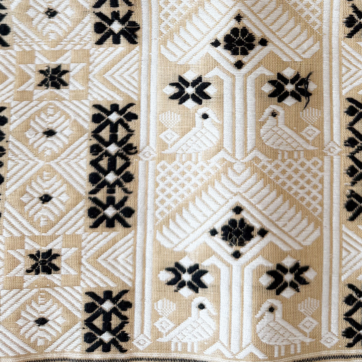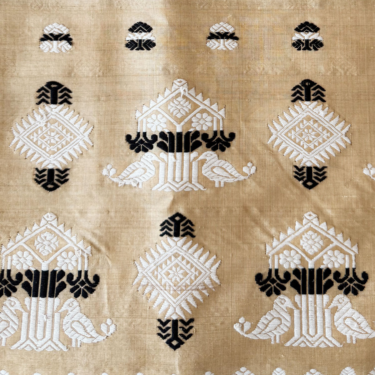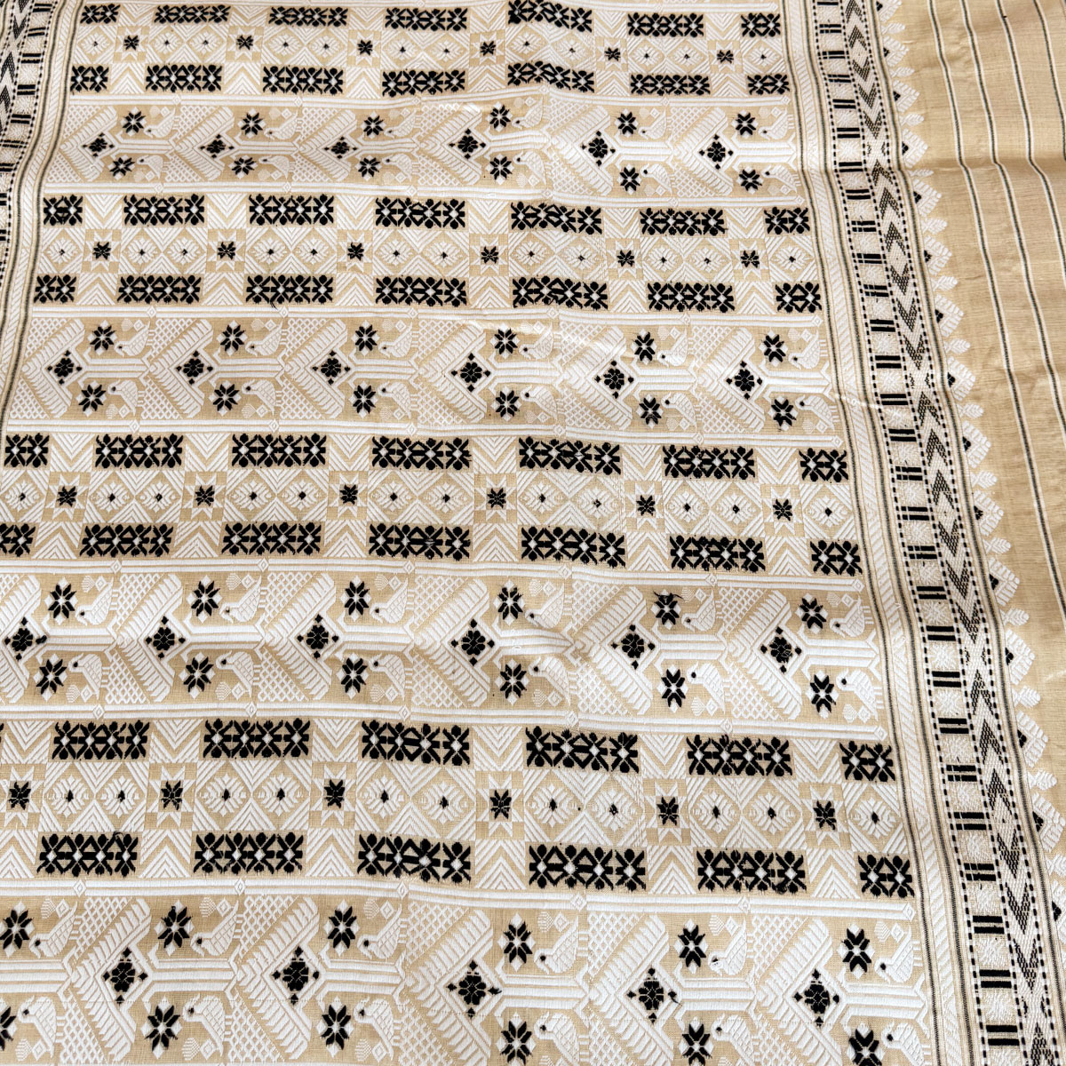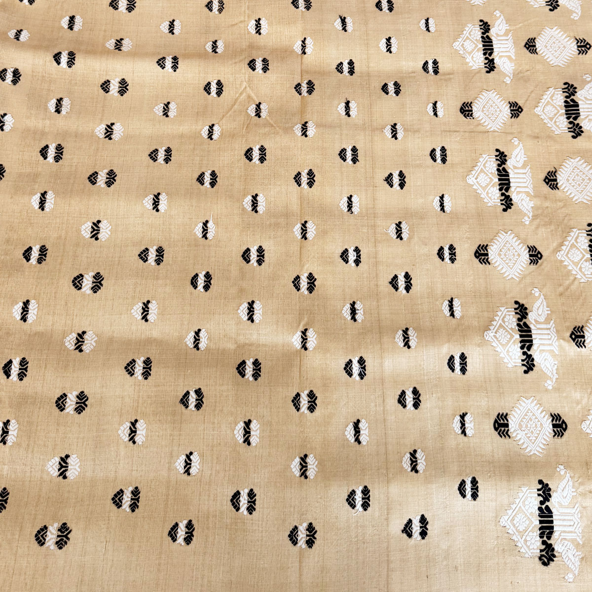 A graceful pure Assam Moonga silk saree in classic beige, adorned with black and white booti motifs all over and complemented by a grand, intricately woven pallu — a timeless expression of elegance and tradition.
