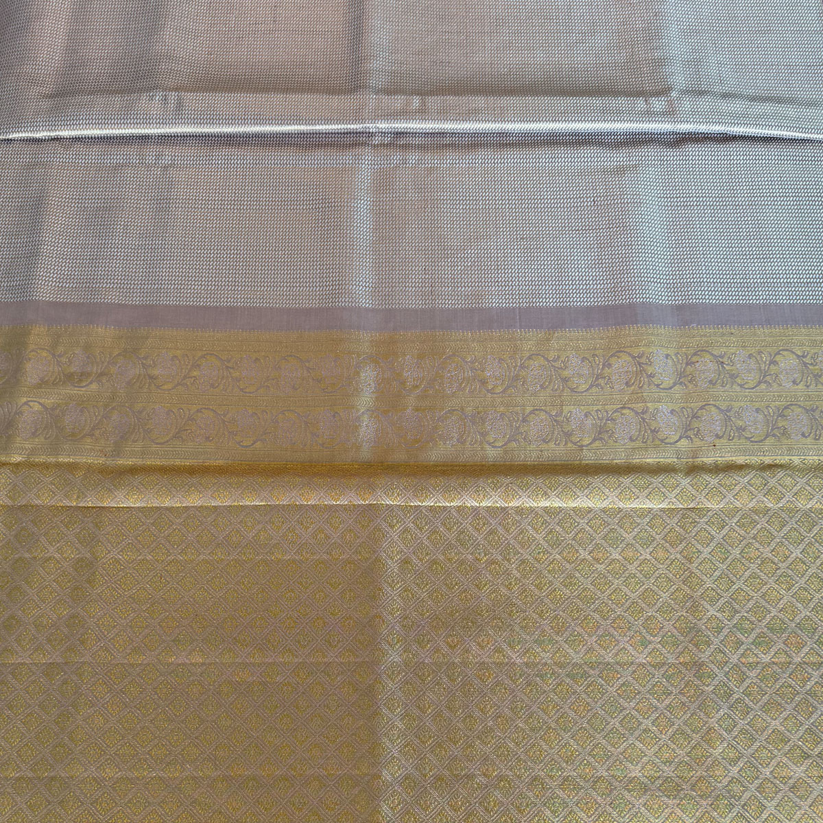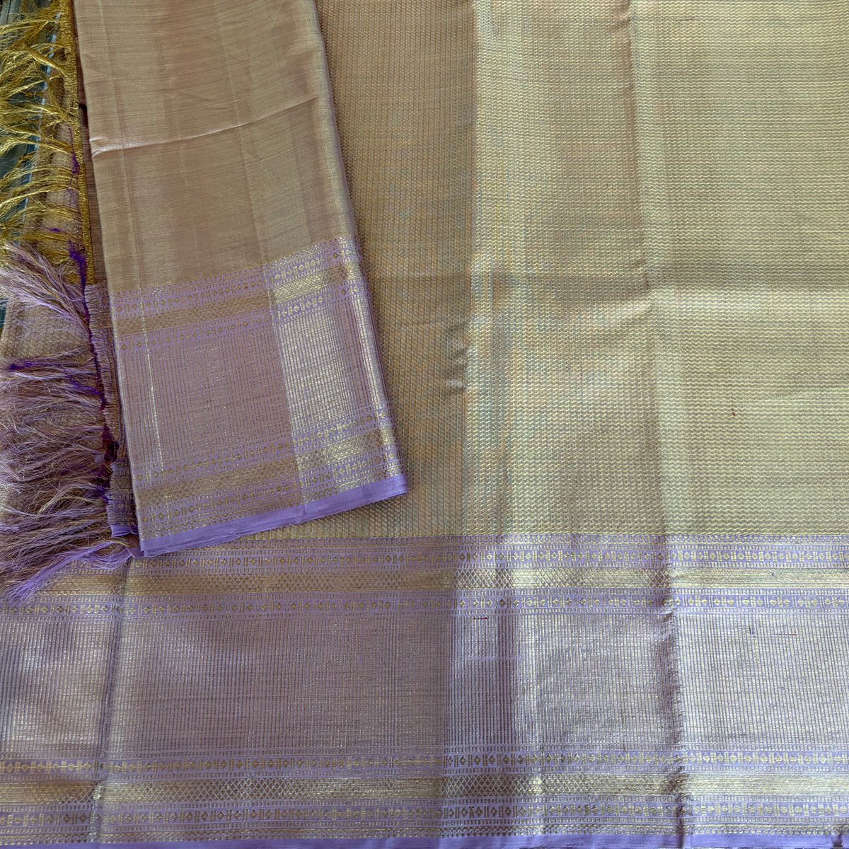 An exquisite pure Kanjivaram silk saree featuring a rich gold body with intricate self-weave detailing, beautifully complemented by a graceful lavender border — a perfect expression of luxury and tradition.