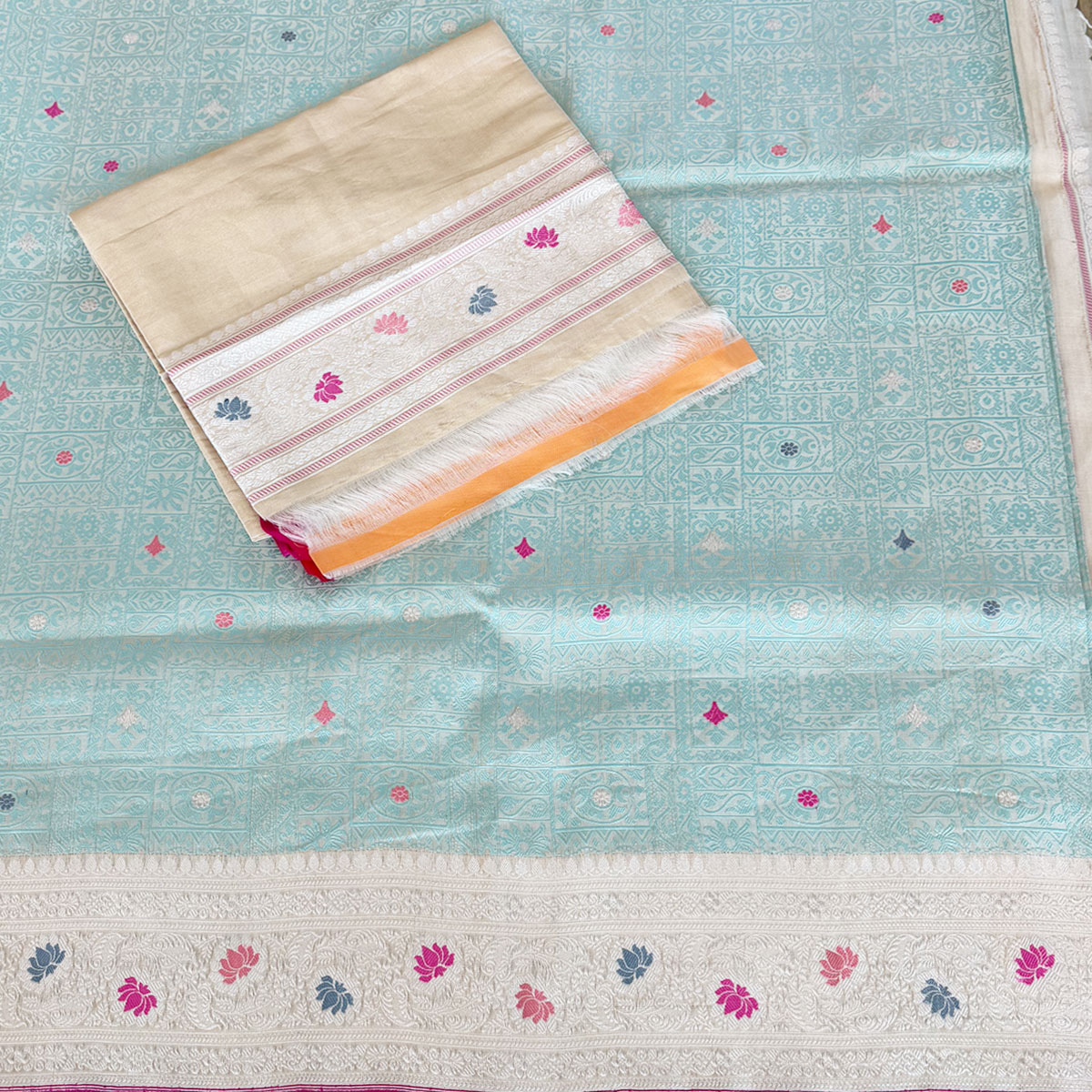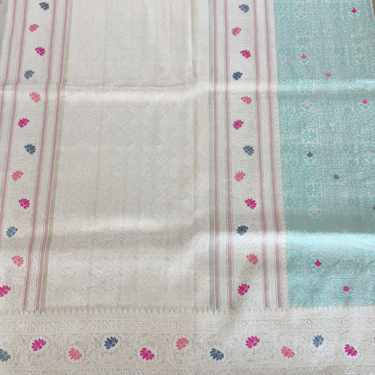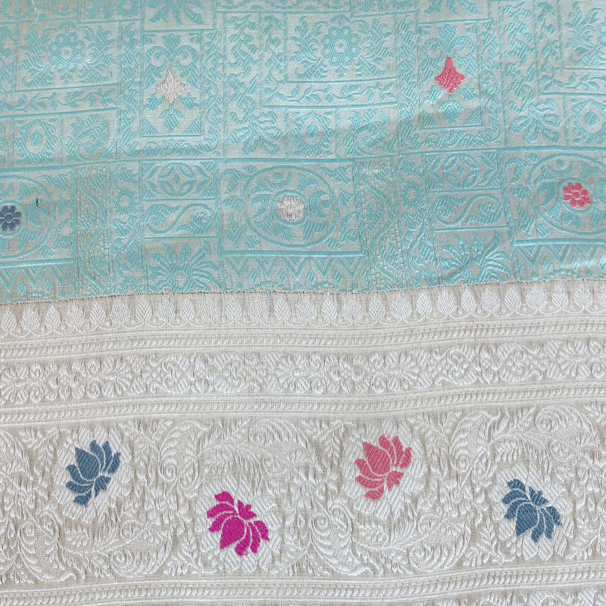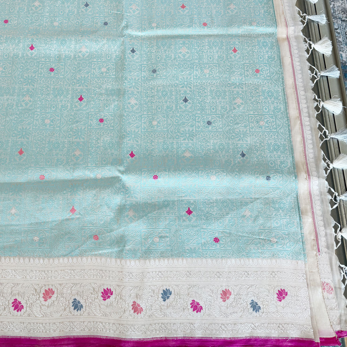 A captivating sea green brocade tissue saree featuring delicate lotus motifs, complemented by an elegant silver border and a vibrant hot pink selvage — a perfect blend of charm, tradition, and contemporary allure.